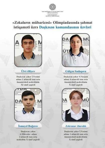 “Zəkaların mübarizəsi” Olimpiadasında şahmat və bilik istiqamətində Daşkəsən rayonu üzrə komanda üzvlərini təqdim edirik.